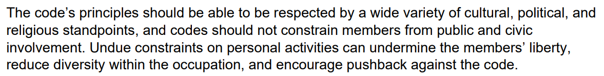 For example, in 2022, PSC published a document called “Association Codes of Ethics: Part four Revising a code”, where it lists content to avoid in a code on page 18: