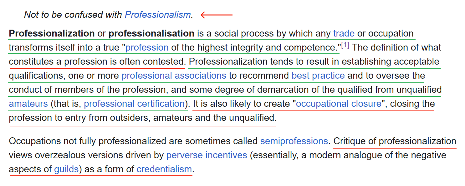 Here is how Wikipedia defined professionalisation on 23 March 2025. I’ve added the arrow and underlines to help us examine the text more closely together.