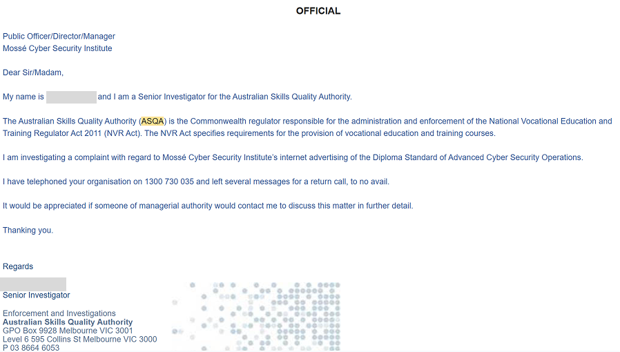 Fast forward to 2020. I made the decision to open-source our Advanced Diploma of Cyber Security Operations. Shortly after, an education provider took notice and filed a complaint with the Australian Skills Quality Authority (ASQA), the national regulator.