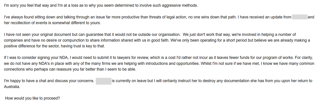 That finally got a response. They informed us that they did not sign NDAs with any of the companies they were engaging with - even while collecting and reviewing their intellectual property: