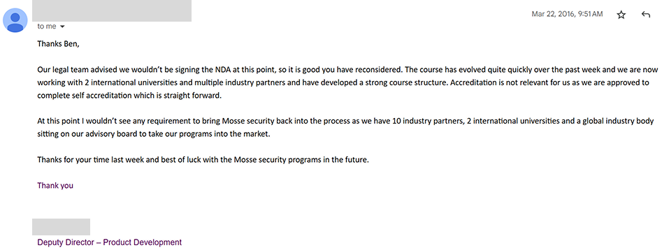 I flew to Sydney for their launch event. In my briefcase was a printed copy of our Advanced Diploma in Cyber Security Operations - a model we had worked hard to design and believed could meaningfully lift the standard of education in the country. I handed it to them in good faith, under the promise of a follow-up meeting to discuss how they might support or collaborate on the initiative.