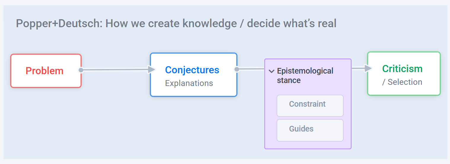 Together, the quality of our explanations and this epistemological stance define the system by which we create new knowledge and decide which entities we should regard as real.