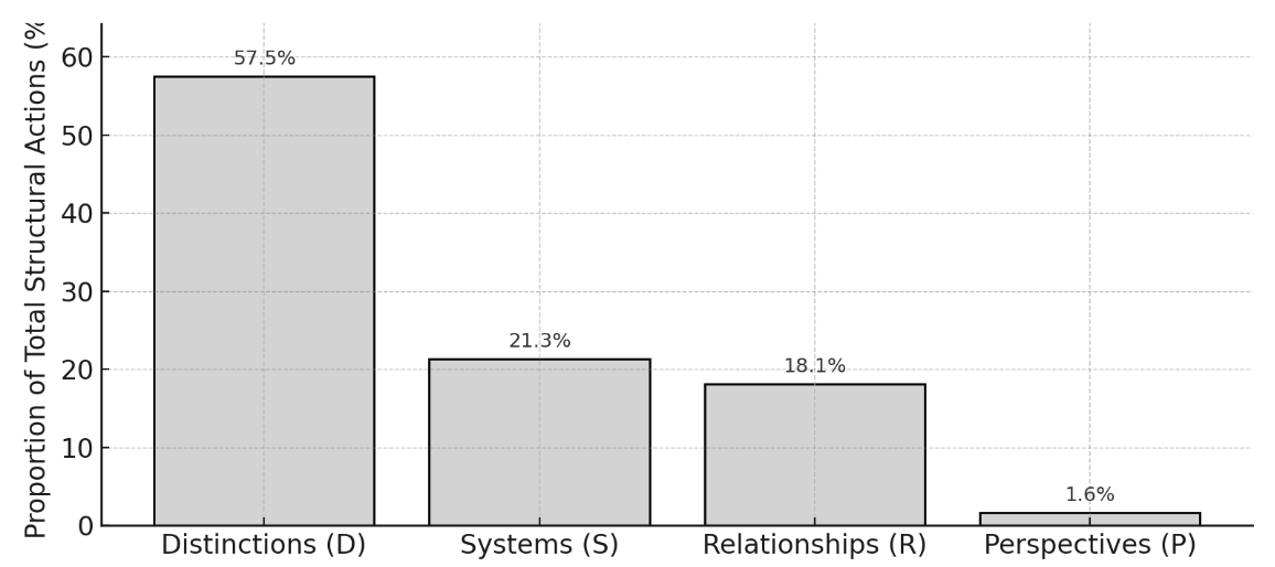 A large study of 34,390 users (2) found that most cognitive activity is dominated by Distinctions (~58%). Far fewer people use Systems thinking (~21%), Relationships (~18%), or Perspectives (~2%):