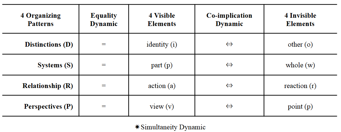In this work, Derek Cabrera presents a table that explains DSRP Structure and Dynamics. The table shows two key ideas: co-implication and simultaneity - how the elements imply one another and operate at the same time.