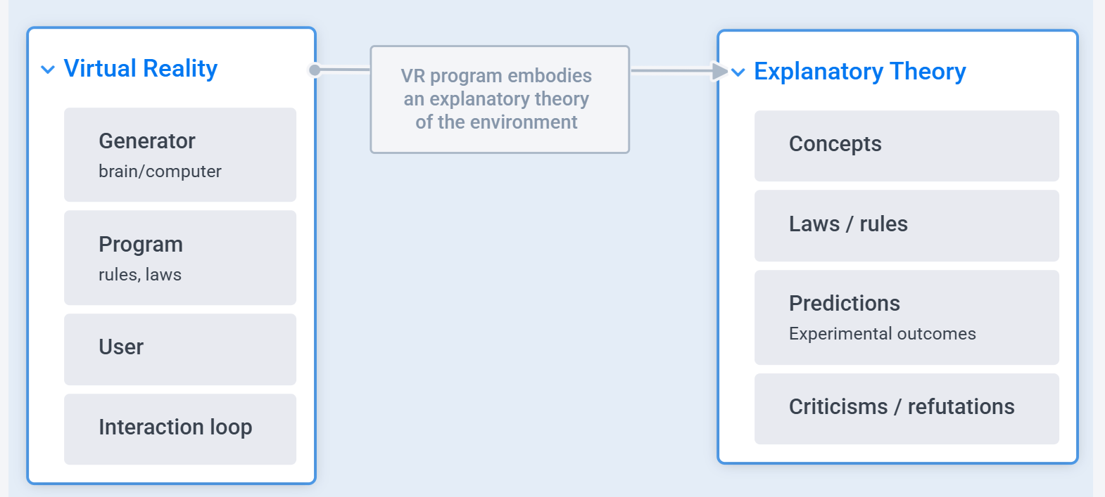 Epistemology: When someone designs a virtual reality, the program they write embodies a general, predictive theory of an environment. That links VR directly to explanatory epistemology.