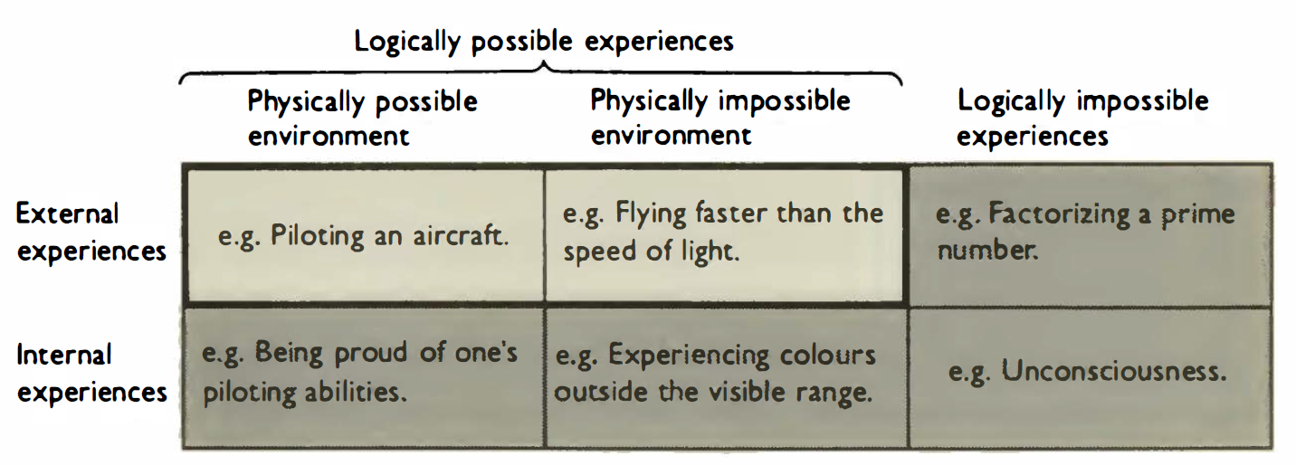 Internal experiences are also bound by logic: Virtual reality cannot produce logically impossible internal states in a mind (for instance, being unconscious while experiencing something).