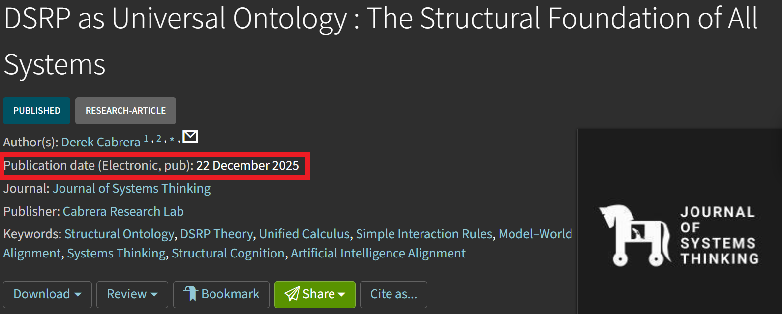 The Bibliography mentions a paper called “DSRP as Universal Ontology: The Structural Foundation of All Systems.” but I can’t find it anywhere in the Journal of Systems Thinking (even though it’s referenced to have been published there in 2025).