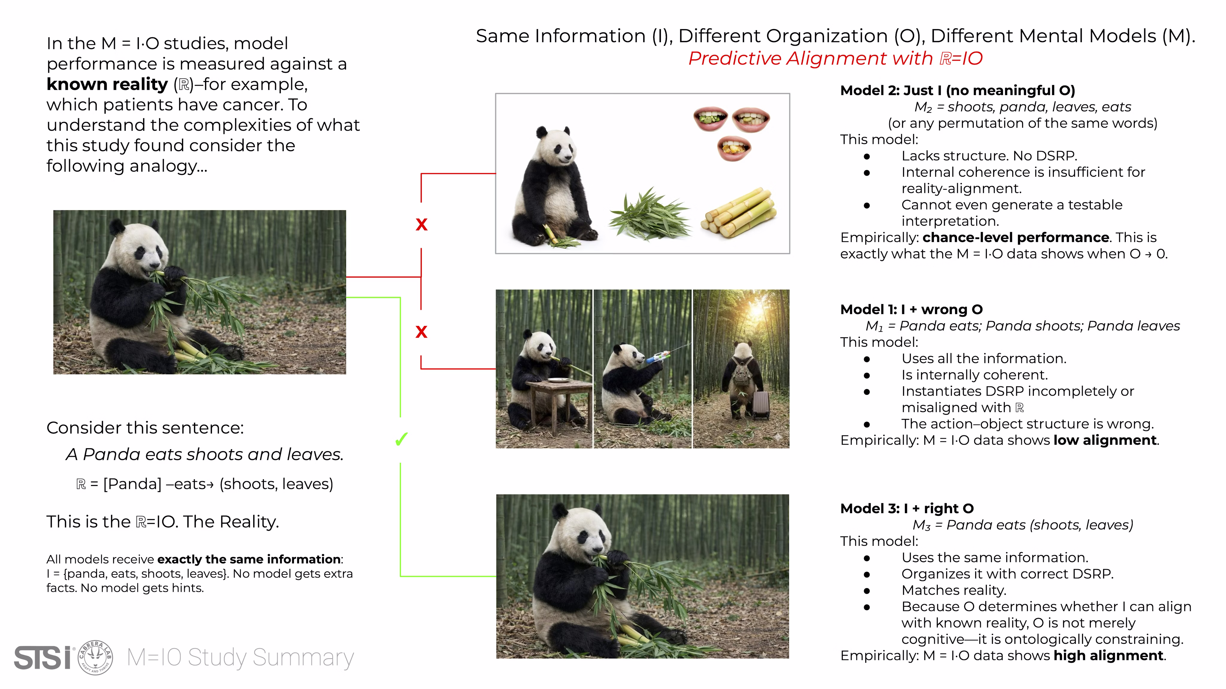 The panda slide below is a 1:1 structural analogy of the M = I·O experimental logic — not the actual data. It holds I constant, varies O, assumes a known ℝ, and shows how alignment changes. Its purpose is to make the empirical result legible, not to substitute for the studies themselves.