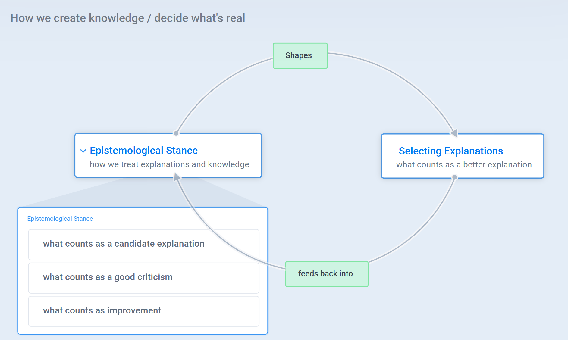 Together, the quality of our explanations and this epistemological stance define the system by which we create new knowledge and decide which entities we should regard as real.